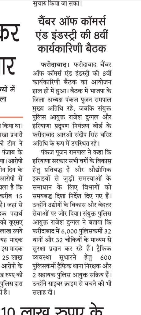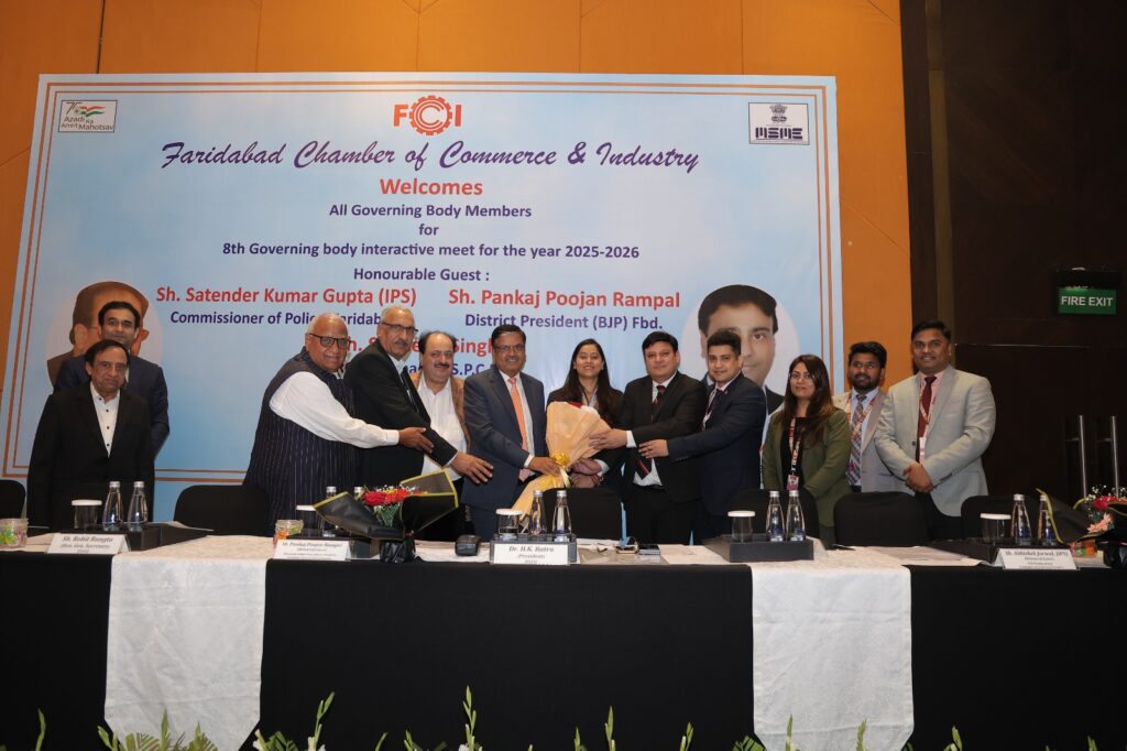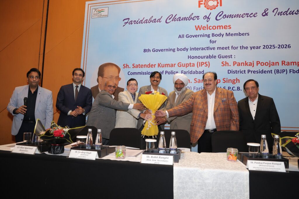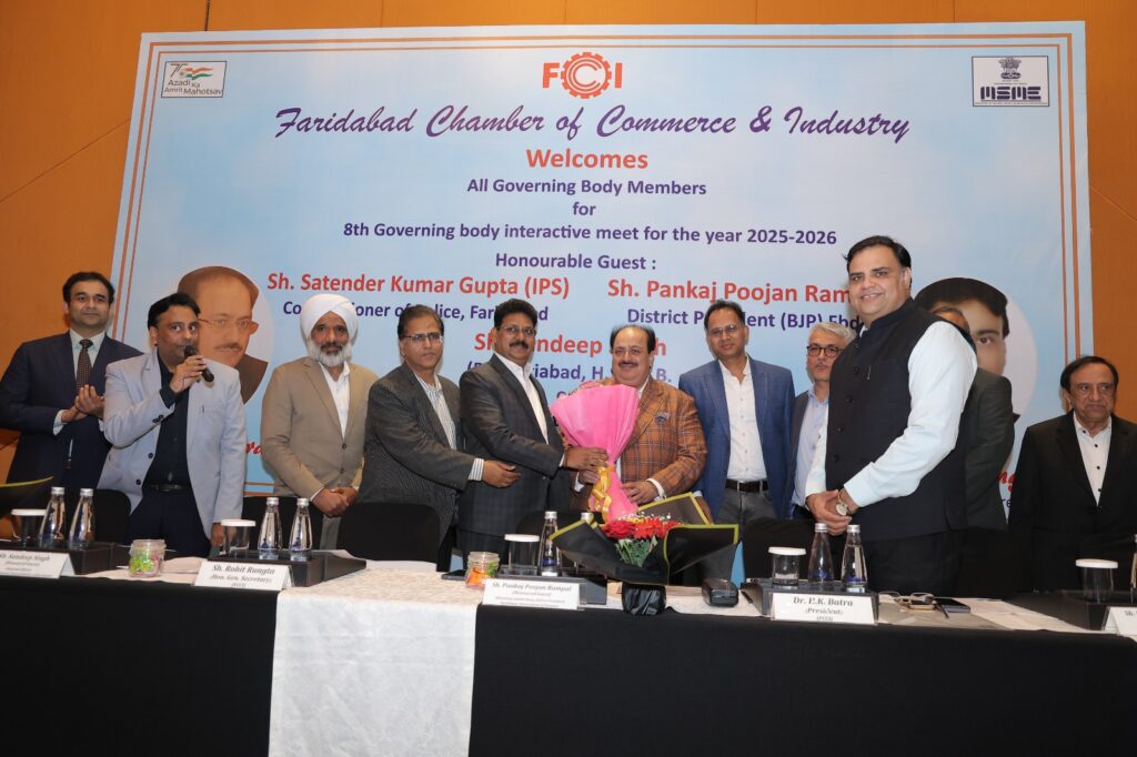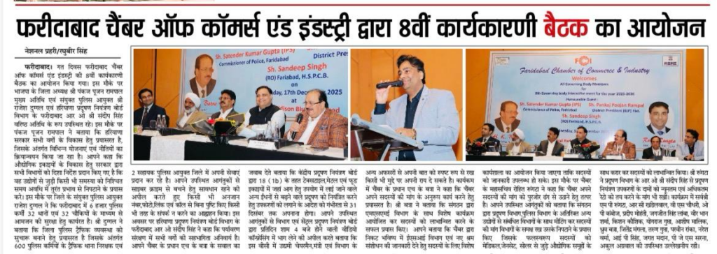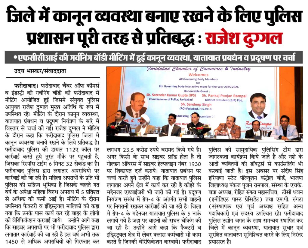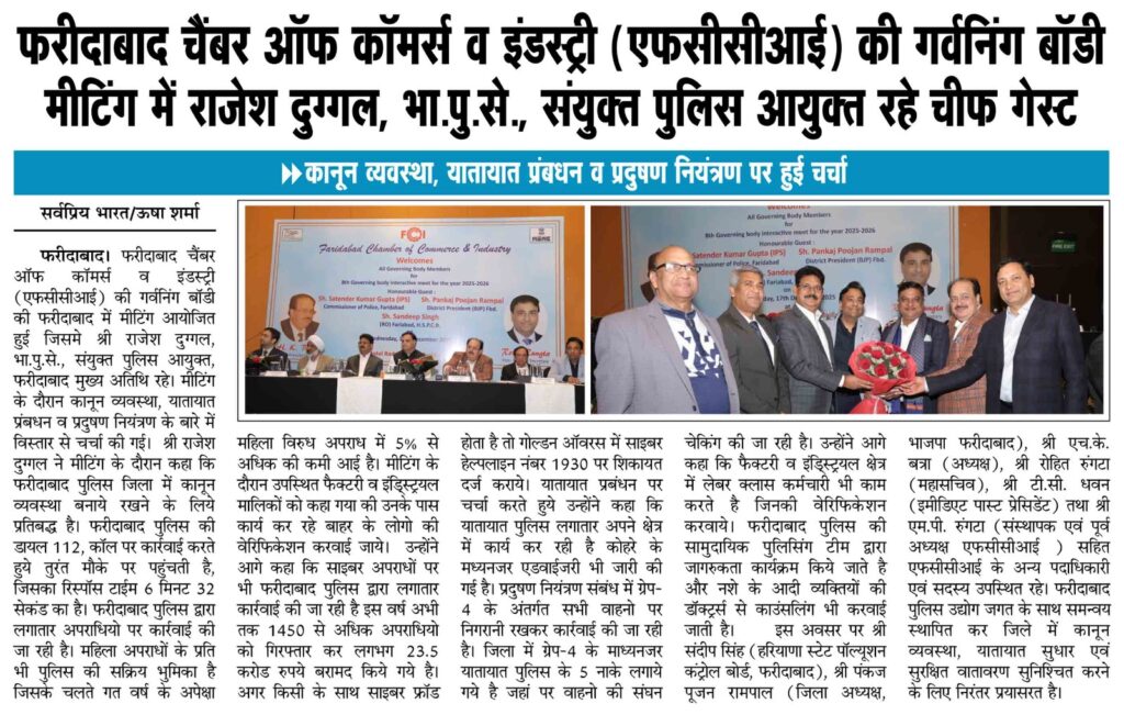 Read More FCCI’s 8th Governing Body Meet focuses on law & order, cyber safety, traffic and pollution control फरीदाबाद पुलिस सबसे तेज, 6.32 मिनट में पहुंच जाती है डायल 112 पीसीआर फरीदाबाद चैंबर ऑफ कॉमर्स एंड इंडस्ट्री की 8वीं कार्यकारिणी बैठक आयोजित